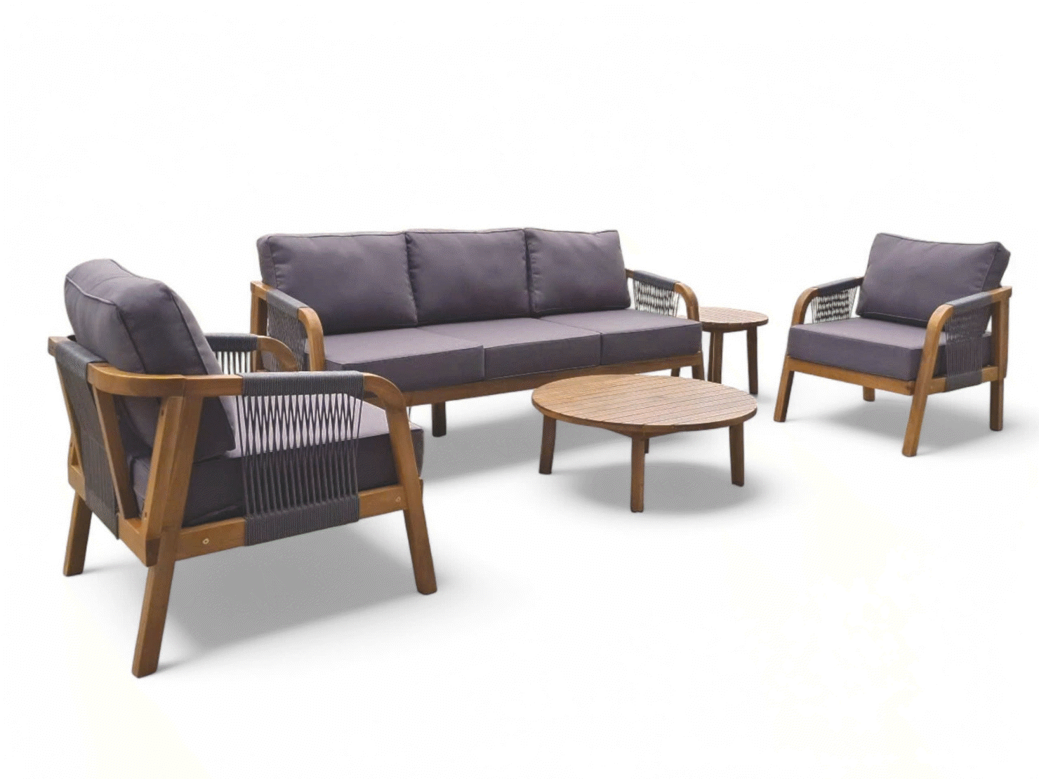 This sofa garden set is made from high-quality acacia wood, featuring a trendy rope-woven pattern that enhances its texture and gives it a modern appearance. This stunning natural wood set is finished with cushions in neutral greycolors for comfort.