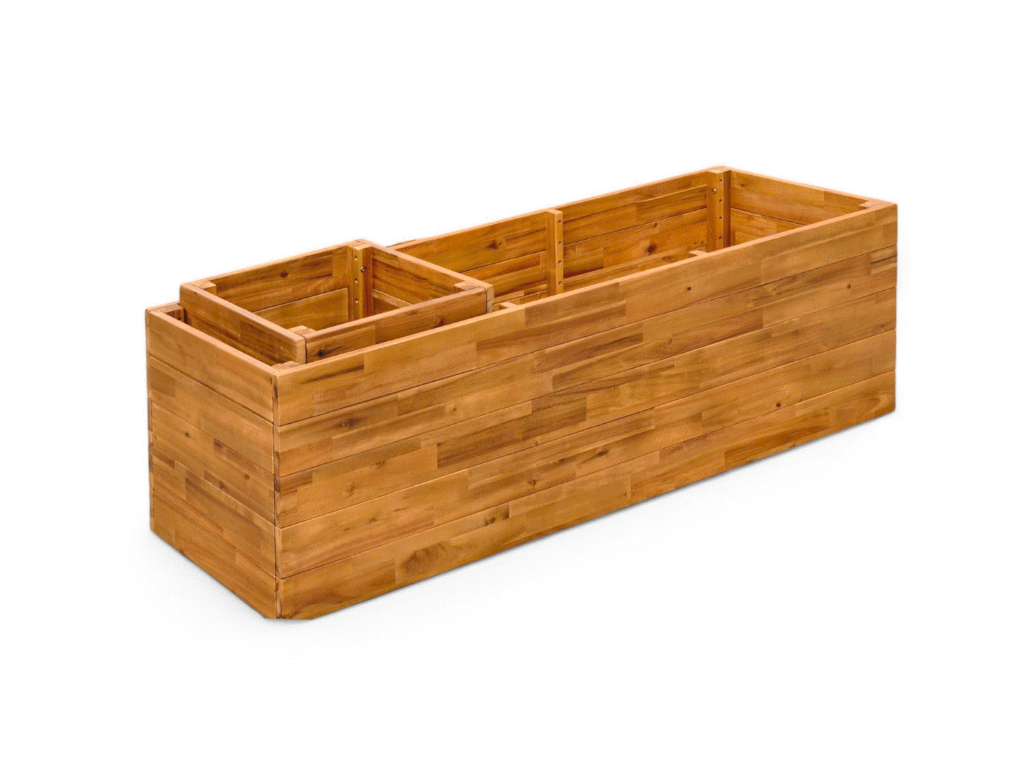 The plant pot is made from sturdy acacia wood, with a natural color and beautiful, harmonious grain. The pot comes in various sizes for customers to choose from and is easy to assemble, making it convenient.
