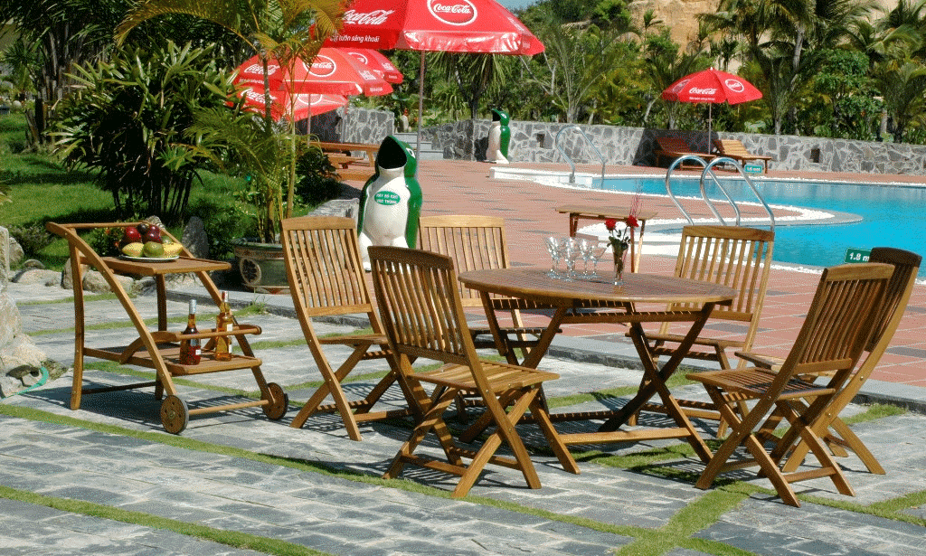 The dining set is made of premium Acacia wood, with natural wood grain and harmonious natural colors, creating a warm feel suitable for outdoor use.
